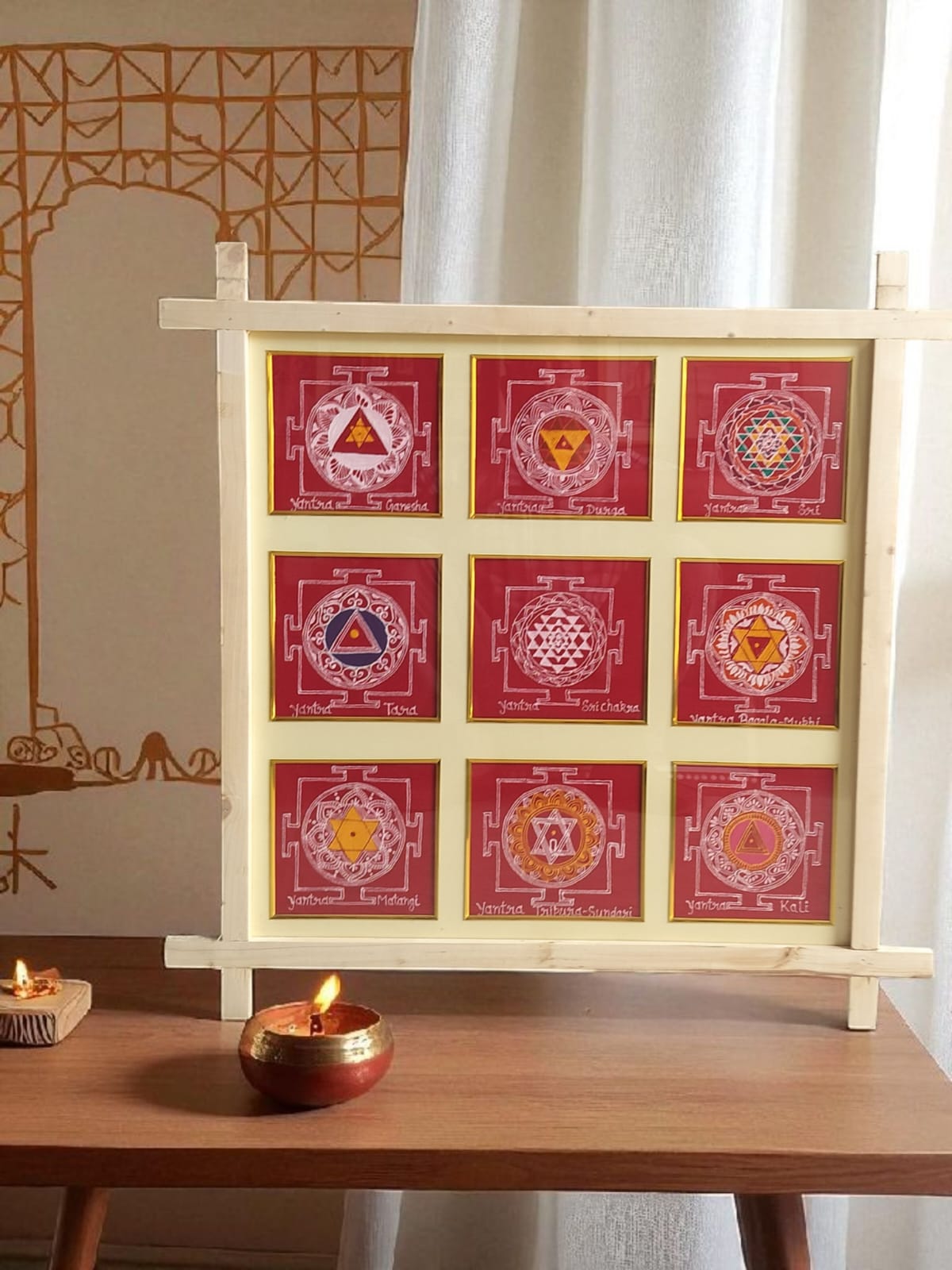 Embrace the sacred fusion of ancient spiritual science and traditional Kumaoni artistry. This exquisite Aipan-painted frame brings together nine powerful yantras, each meticulously hand-painted by women artisans from Uttarakhand using natural dyes and time-honored techniques.