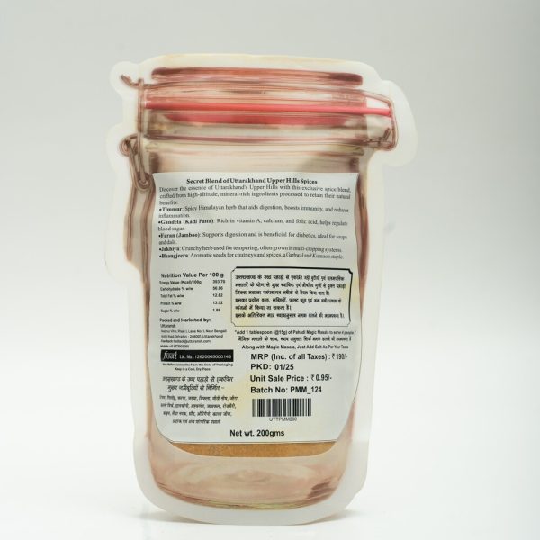 Bring home the taste and goodness of the Himalayas with Uttaransh Pahadi Magic Mix Masala. This handpounded, all-purpose masala is made using traditional recipes and over 18 powerful Himalayan herbs and spices like timur, faran, jakhiya, giloy, triphala, and more.