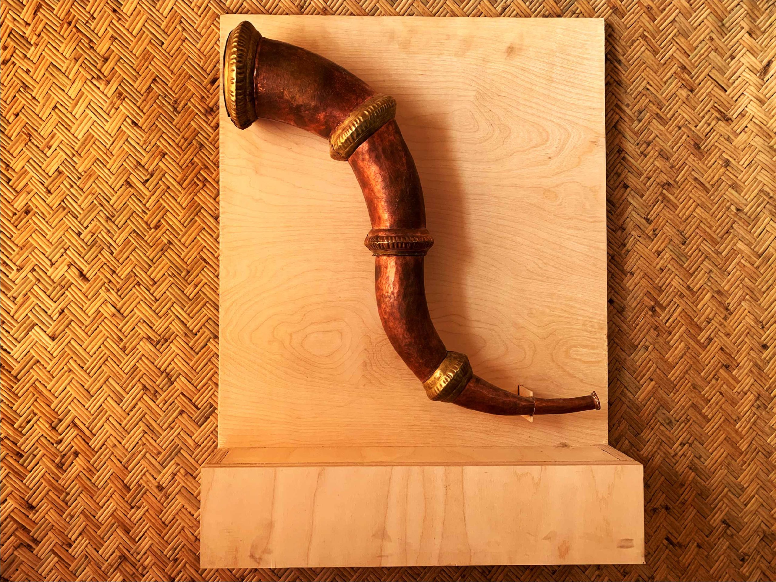 Expertly shaped from pure copper by skilled artisans, this souvenir captures the distinct crescent or S-shaped form of the original instrument, making it a striking decorative piece and a meaningful reminder of the region’s rich musical and spiritual heritage. Whether placed on a shelf, desk, or altar, the Ransingha souvenir is a perfect blend of heritage art and devotional significance.