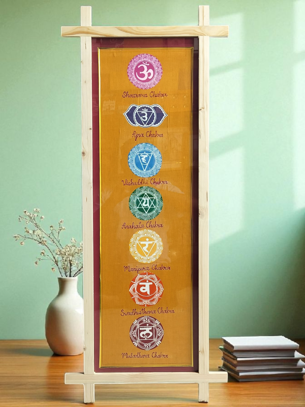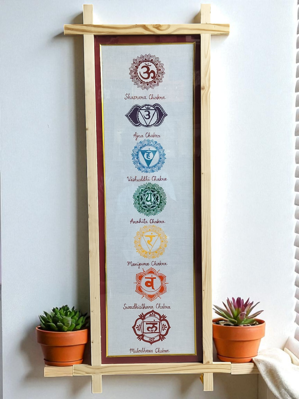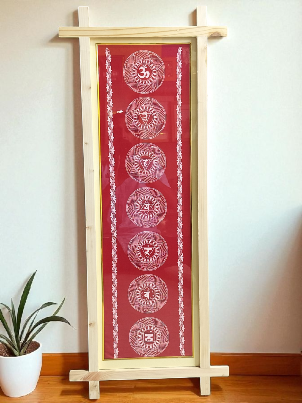 A Sacred Energy Map in Traditional Kumaoni Art – This vertically aligned chakra tapestry showcases authentic Aipan-inspired designs printed on premium 100% cotton fabric, stretched over a sustainable wood frame. The breathable natural fabric ensures vibrant color retention while honoring traditional textile wisdom.