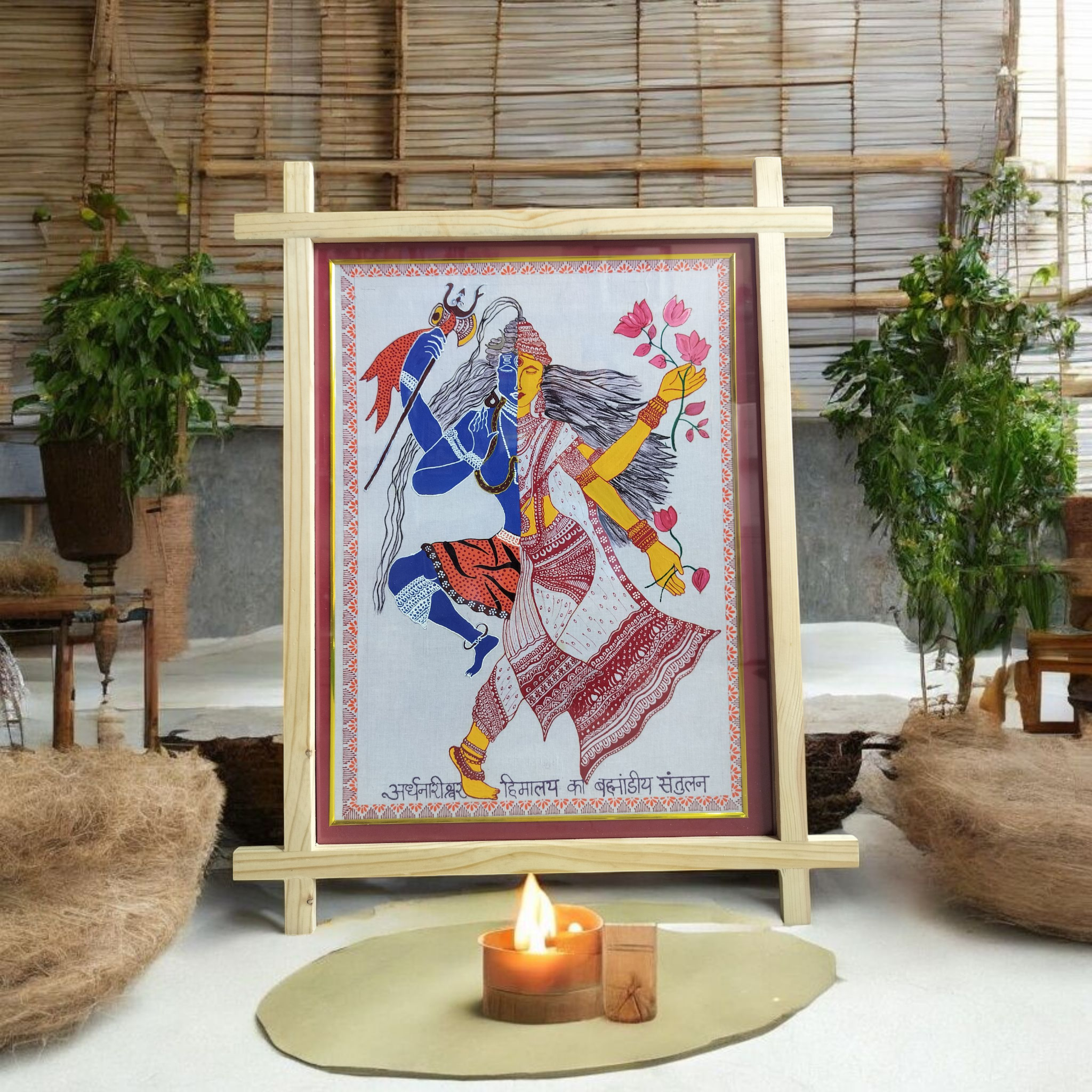 Embrace the divine energy of Shiv Shakti with this exquisite Aipan painting, meticulously handcrafted by the skilled artisans of Uttarakhand.